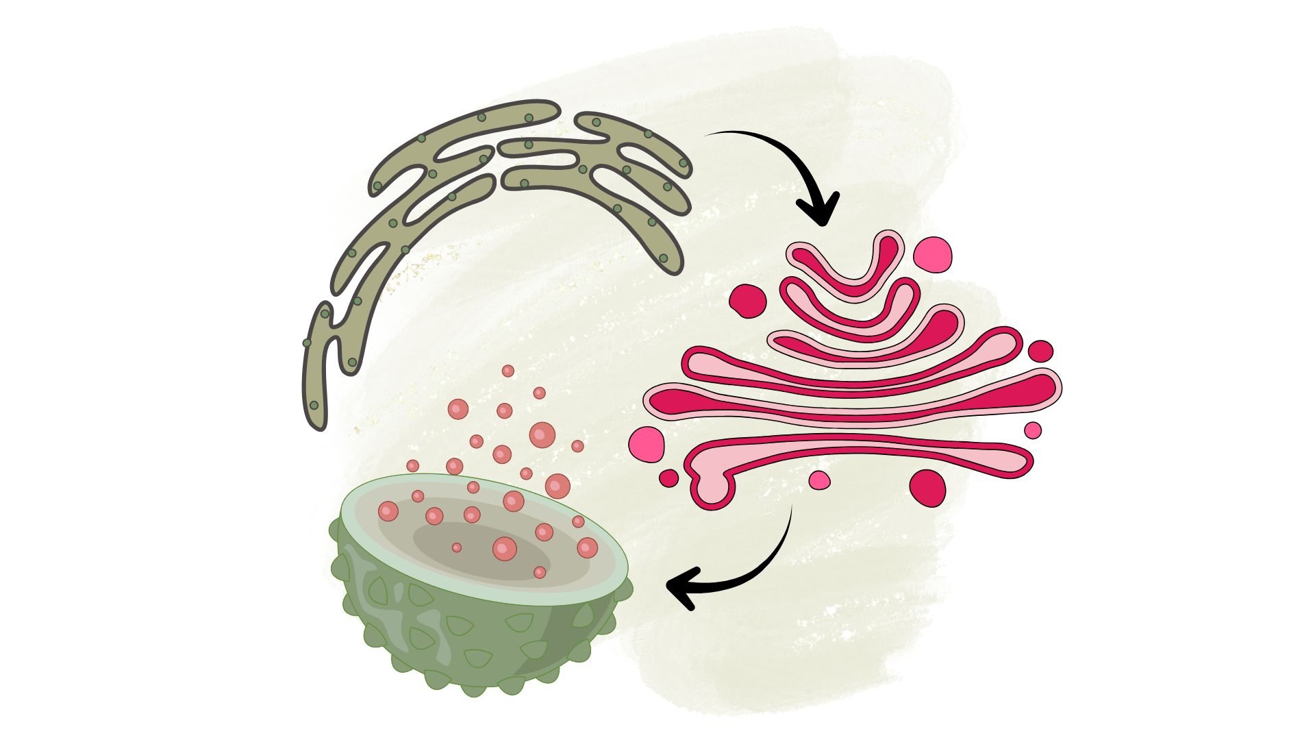 Recorrido de las glucoproteínas desde su síntesis en el ribosoma en el retículo endoplasmático rugoso hasta la degradación de polímeros.